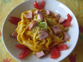 | Tagliatelle mit Kürbissoße und Kürbis-Zucchini-Bratlingen |