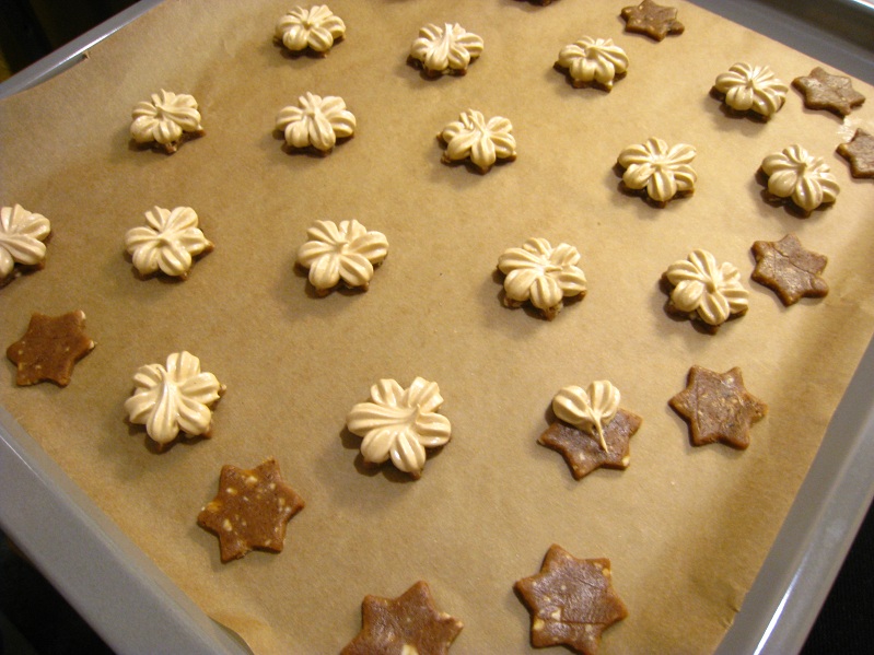 Das Baiser aufzuspritzen ist schon mühselig und das Rezept ist für 100 Stück ausgelegt. Ich habe ein Fünftel des Rezepts gebacken, kleine Sternausstecher von einem Durchmesser von 3,5 cm (Zacke zu Zacke) genommen und knapp 30 Stück herausbekommen.
